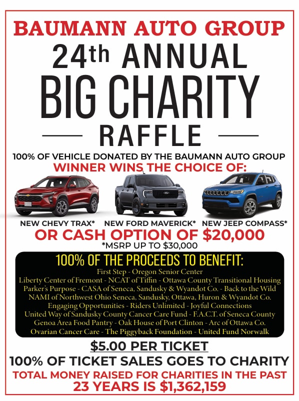 Twenty area charities will be the big winners from this special event. They include Liberty Center of Fremont, First Step in Fostoria, NAMI of Northwest Ohio Seneca, Sandusky, Ottawa, Huron & Wyandot Counties, Ottawa Co. Transitional Housing of Port Clinton, NCAT of Tiffin, CASA of Sandusky, Seneca & Wyandot Counties, Riders Unlimited, Back to the Wild in Castalia, United Way of Sandusky County Cancer Care Fund, F.A.C.T. of Seneca County, Parker's Purpose of Fremont, Genoa Area Food Bank, Arc of Ottawa Co., Oak House of Port Clinton, Oregon Senior Center, Joyful Connections if Port Clinton, Ovarian Cancer Connection of Fremont and Engaging Opportunities in Elmore, The Piggyback Foundation in Norwalk & United Fund of Norwalk. The Baumann Auto Group dealerships and the twenty charities will be selling $5 raffle tickets for a chance to win a new vehicle. 100% OF EVERY TICKET SOLD WILLGO TO THE CHARITIES! The Baumann Auto Group is donating a new vehicle for the Grand Prize. The winner will have the choice of a New Ford Maverick*, New Chevrolet Trax*, New Jeep Compass* (*MSRP up to $30,000) or a Cash option of $20,000. The winning ticket will be drawn November 14, 2026, 1:00pm at Baumann Ford in Oregon.